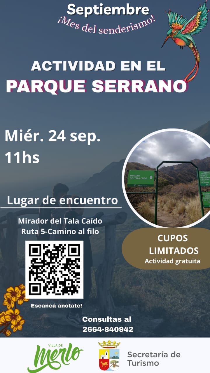 En el marco del mes del senderismo la secretaria de Turismo de la Villa de Merlo realizara caminatas gratuitas por el Parque Serrano.