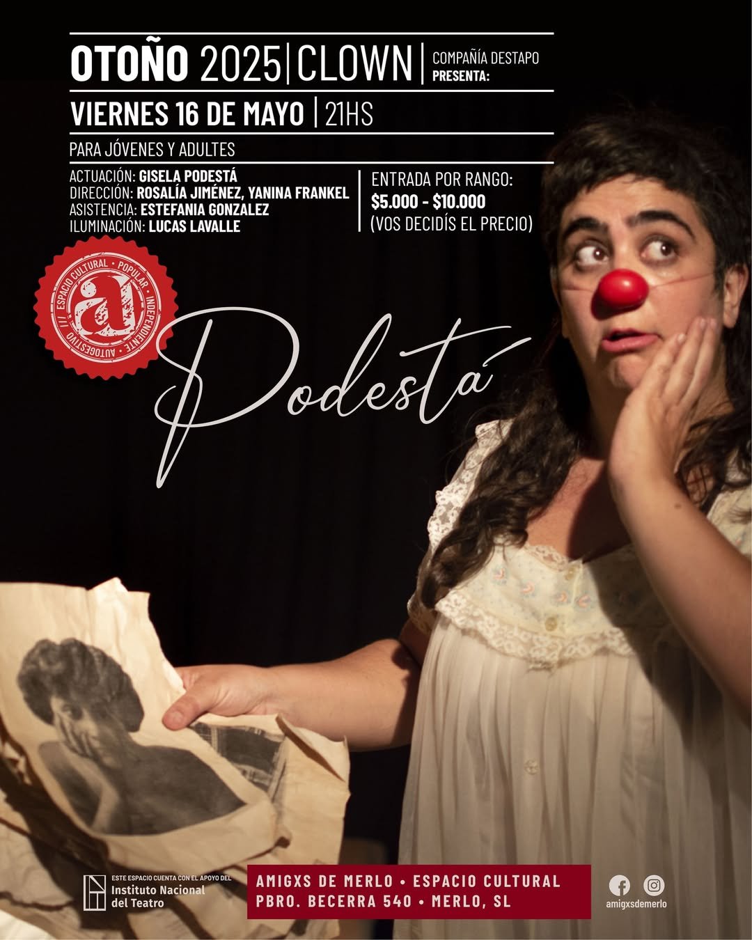 AmigxsdeMerlo Prebistero Becerra 542, Villa de Merlo, San Luis, ArgentinaEl viernes 16 de mayo, a las 21:00hs., la Compañía Destapo (Villa Las Rosas, Cba.) presenta en el Espacio Cultural @amigxsdemerlo “PODESTÁ”, un unipersonal de Clown que nos invita a recorrer la historia del teatro nacional, de la mano de una payasa que al despertar es sorprendida por sus ancestros que la llevan a descubrir sus raíces […]