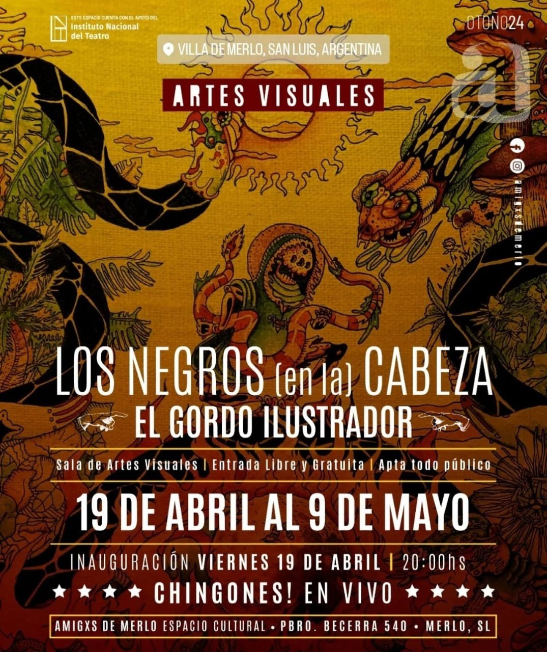 Este viernes 19 de abril a las 20:00hs, se realiza la inauguración de LOS NEGROS (en la) CABEZA. Chingones! toca en vivo. Sala de Artes Visuales. Entrada libre y gratuita. Apta para todo público.