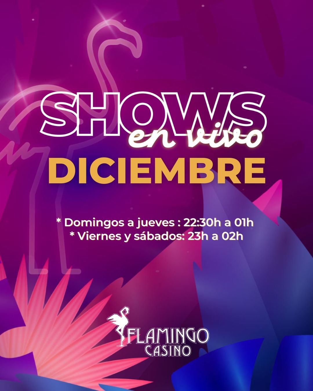 Noches con ritmo, luces y mucha fiesta… SHOW EN VIVO TODAS LAS NOCHES De 22:30 a 01:00 hs en Flamingo Música en vivo, buena onda y la mejor energía.