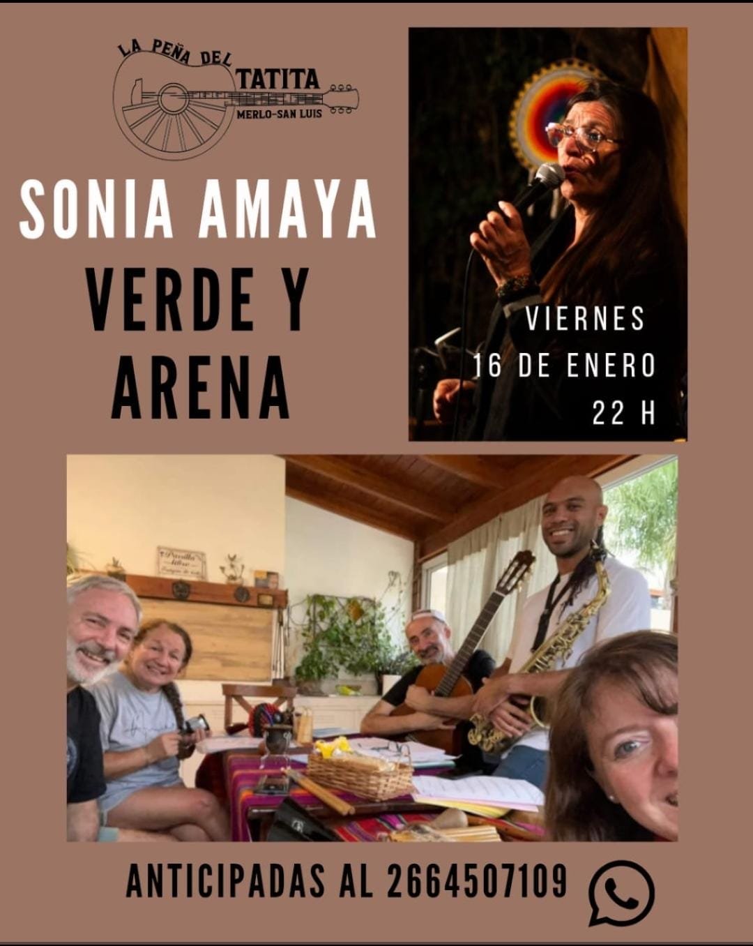 🎶 La Peña del Tatita invita 🎶 🎤 Sonia Amaya🎶 Verde y Arena 📅 Viernes 16 de enero🕙 22 hs📍 La Peña del Tatita – Merlo, San Luis Dos propuestas musicales en una misma noche para compartir canciones, encuentro y emoción. 🎟️ Entradas anticipadas: 2664507109 ¡Los esperamos! |