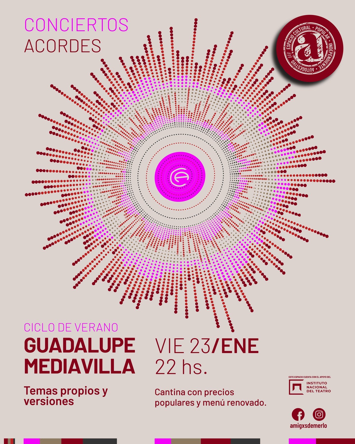 Viernes 23 de enero 22:00 hs Espacio Cultural @amigxsdemerlo (P. Becerra 540, Merlo, San Luis) Guadalupe Mediavilla - Temas propios y algunas interpretaciones. Género música de raiz folklorica, cumbia y algo de swing. Voz, acordeón, guitarra. Presenta canciones de su último disco "Volver a mi". Además, nuestra cantina estará funcionando con precios populares y un […]