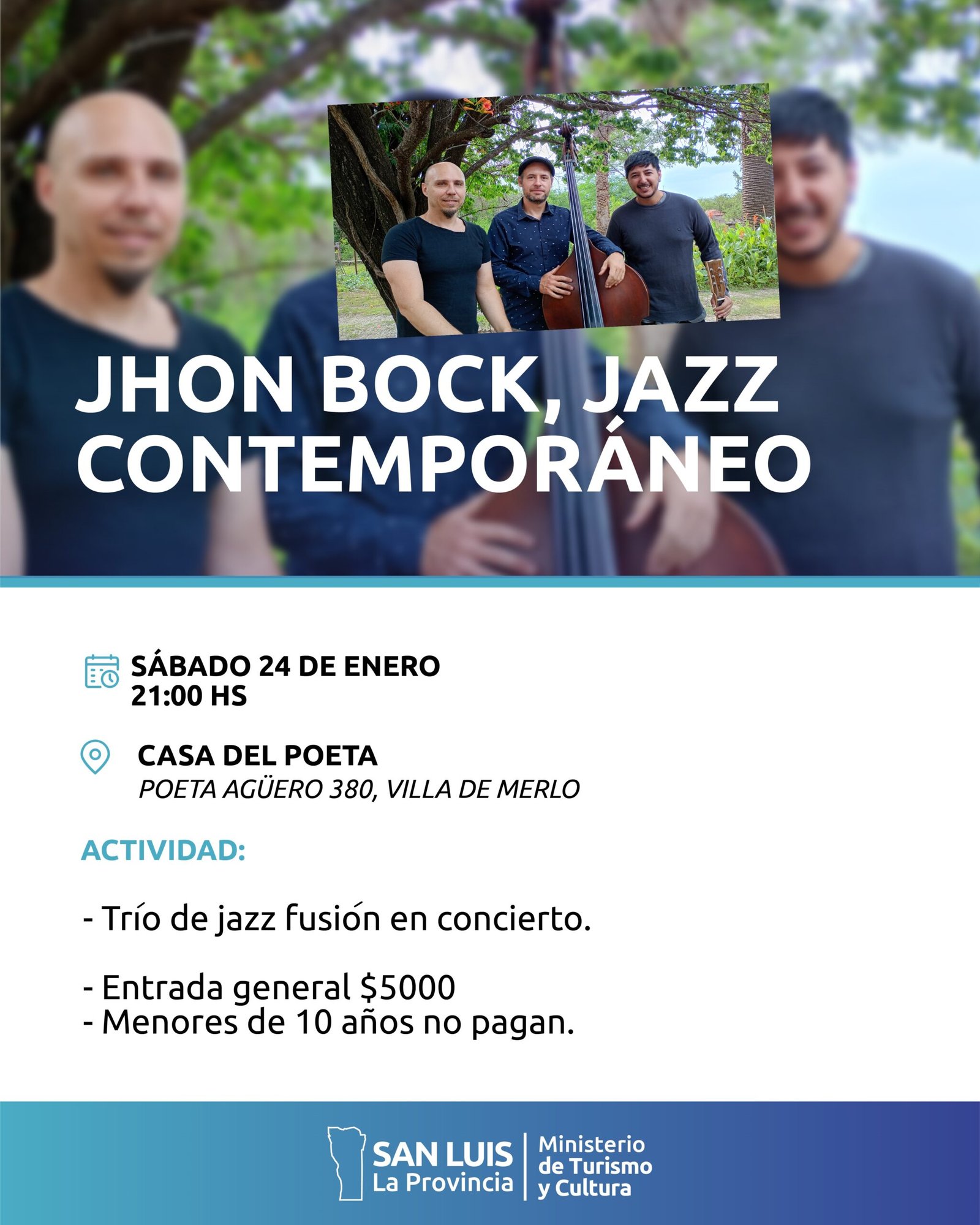 El sábado 24 de enero a las 21:00 hs se presenta “Jhon Bock, Jazz Contemporáneo” en el auditorio de la Casa del Poeta. El trío de jazz fusión brindará un espectáculo en el cual plasman una mirada actual del jazz, fusionando distintos estilos y buscando un sonido propio, abordando un repertorio variado con obras de […]