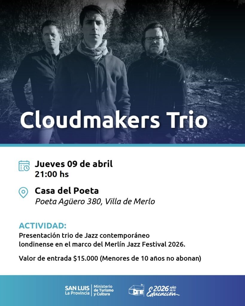 El jueves 9 de abril a las 21:00 hs se presenta la banda Londinense Cloudmakers Trio en el auditorio de la Casa del Poeta, dentro del marco del Merlín Jazz Festival 2026.