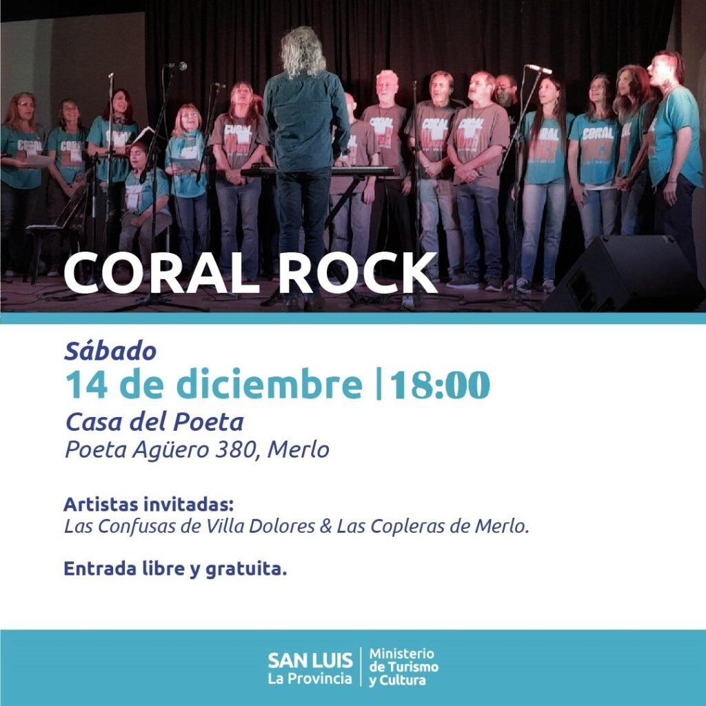 Coral Rock, coro de la Villa de Merlo con más de 10 años de trayectoria, presentará un repertorio de rock nacional, con canciones de León Gieco, Spinetta, Ceratti, entre otros.