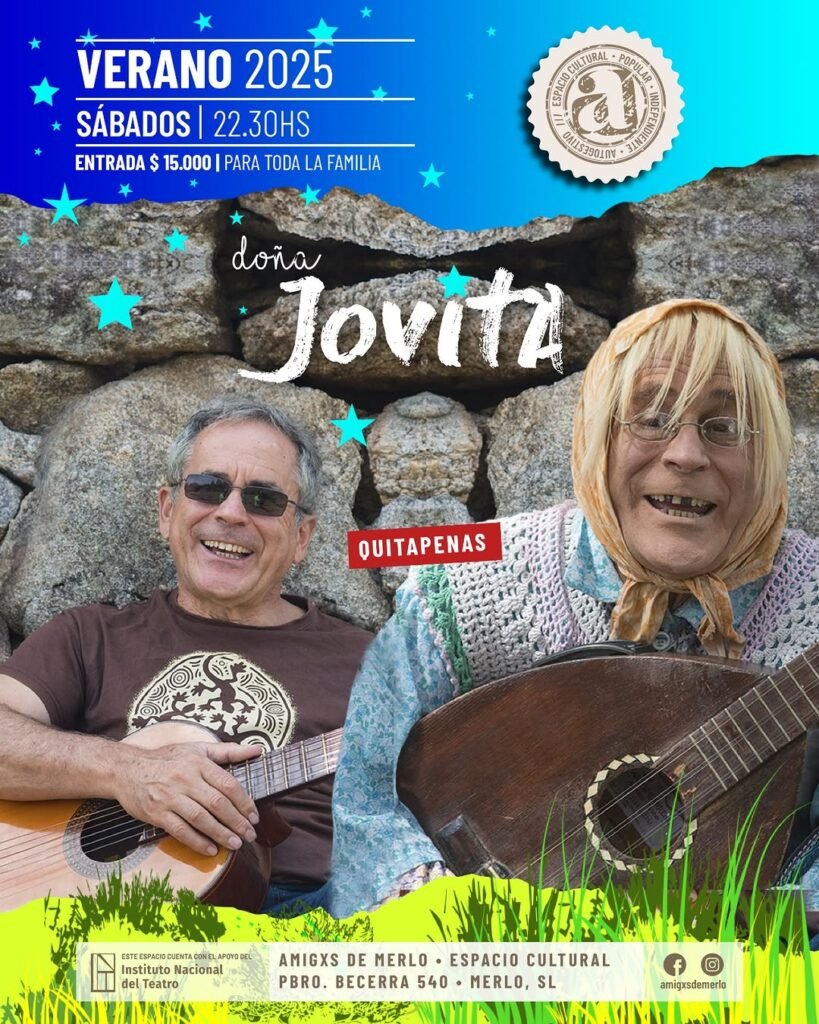 “Doña Jovita” un personaje entrañable de la profunda Córdoba, del pago de Villa Dolores llega para compartirnos su mirada de la vida, con su hermosa sencillez y su noble picardía…. Dice Jose Luis sobre ella: “Doña Jovita posee algo de Cantinflas, de Minguito, del Chavo, del verdadero y puro humor. Creció sin querer, por pequeñas alocuciones. Una especie de ‘Inodoro Pereyra’ que se desarrolló sin la intención de generar un éxito. Hacer un personaje femenino fue toda una decisión, porque una mujer tiene mucho silencio amontonado en esta cultura. La viejita está inspirada en varias abuelas de montaña, es real, una anciana pobre, que desde la adversidad hace de la vida una experiencia linda, maravillosa. Es mujer, vieja, pobre, porque ‘lo que más cundía en esos tiempos era la abundancia de escasez’-dice-, es del Interior, las tiene todas en contra. Igual, hace flores de sus penas. Su objeto es hacernos ver siempre desde otro lugar, con otro cristal, hacernos ver desde ‘tras-las-sierras’ para poder vernos a nosotros mismos y acercarnos a nuestra verdad más íntima…”