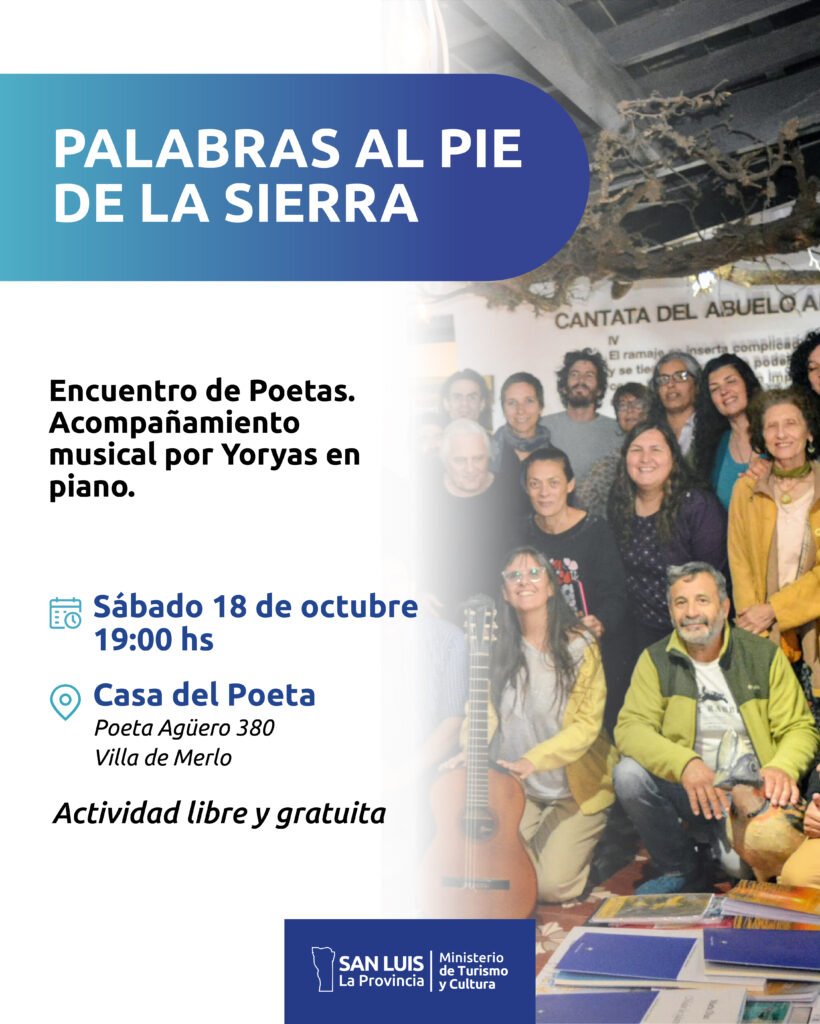 El sábado 18 de octubre a las 19:00 hs se llevará a cabo el Encuentro de Poetas “Palabras al Pie de la Sierra”.