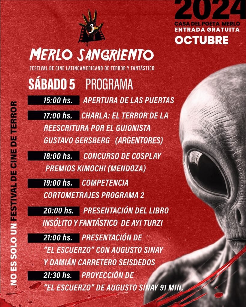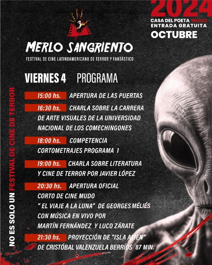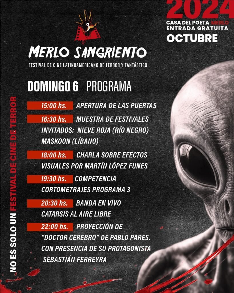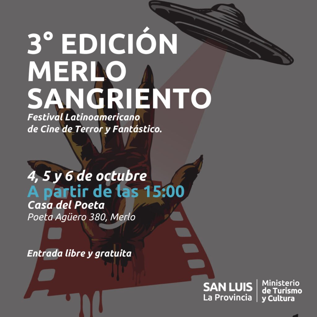 El viernes 4, sábado 5 y domingo 6 de octubre a partir de las 15:00 hs se llevará a cabo la tercera edición de “Merlo Sangriento”, Festival Latinoamericano de Cine de Terror y Fantástico.