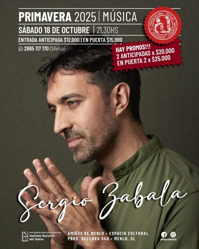 El sábado 18 de octubre a las 21:30hs. en el Espacio Cultural @amigxsdemerlo se presenta Sergio Zabala con un nuevo espectáculo, donde nos invita a un viaje musical a través de sus distintos trabajos discográficos, presentando una selección de sus propias composiciones y arreglos de grandes referentes del folclore argentino como Raúl Carnota, Atahualpa Yupanqui, Félix D. Palorma y también obras de artistas como Chico Buarque y Joan Manuel Serrat.