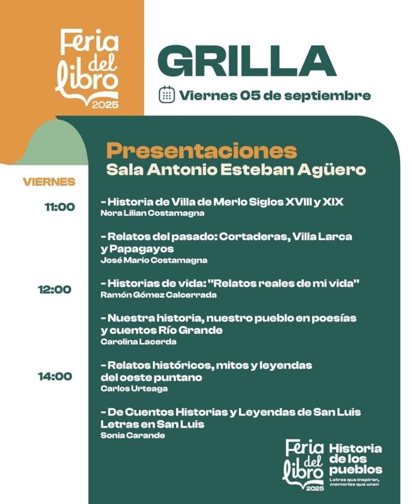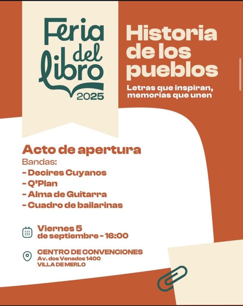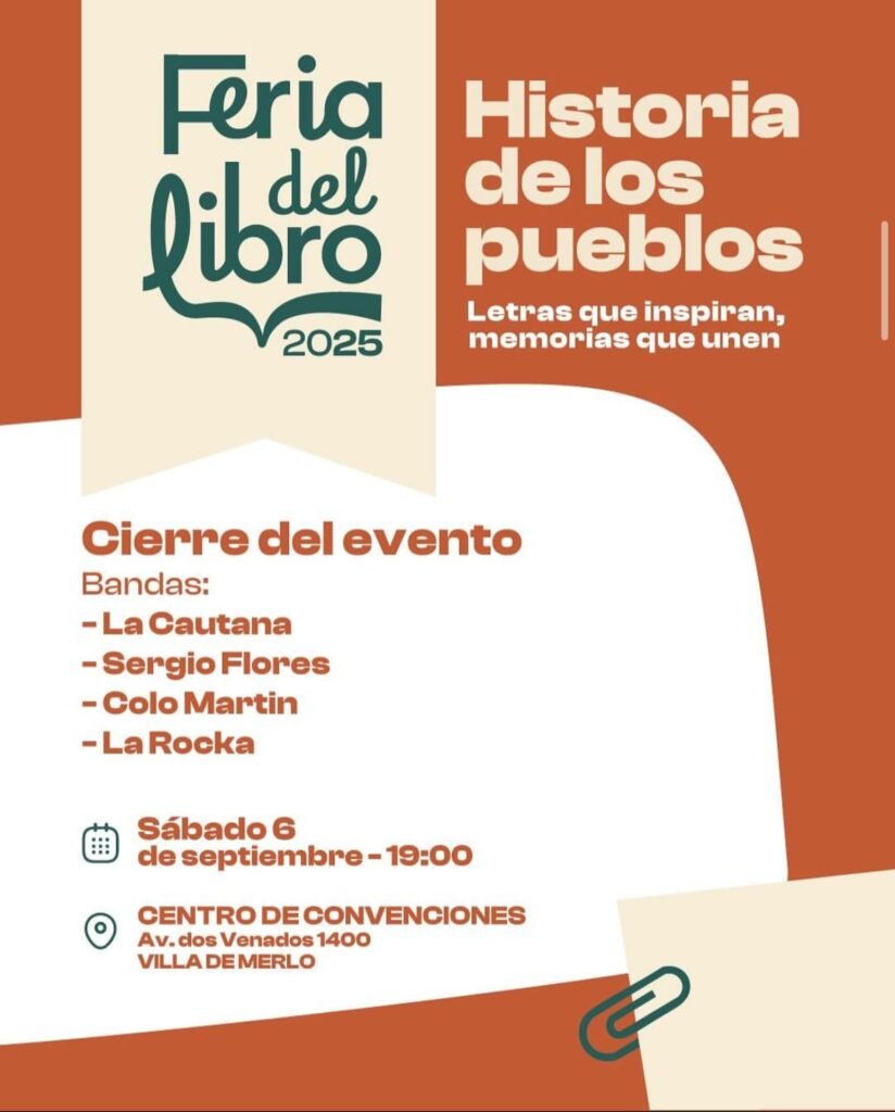 Este viernes 5 y sabado 6 de septiembre la Villa de Merlo será sede de una nueva edición de la Feria del Libro 2025- Entre canciones e historias. Letras que inspiran, memorias que unen.