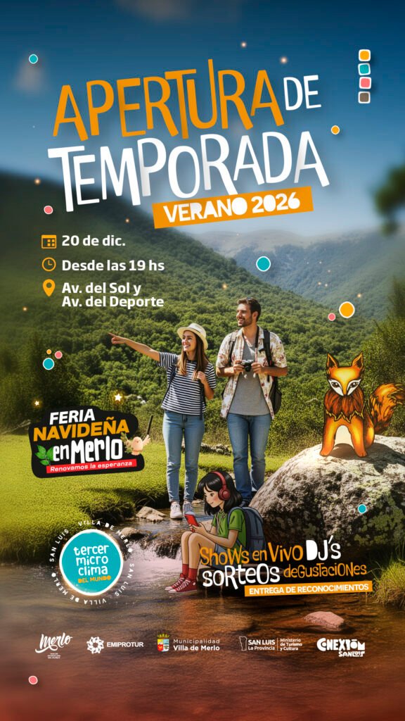 ÚLTIMAS NOTICIAS “Costumbres Merlinas” y caminatas guiadas: cONOCE LAS PROPUESTAS GRATUITAS DE ESTE VERANO. 01/01/2026 se simplifica el registro de guías mientras se prepara la nueva ordenanza para 2026 30/12/2025 Villa de Merlo inaugura su Temporada de verano 2026 con un evento para todos los gustos 19/12/2025 Merlo acompaña los 34 años de Sierra de las Quijadas y fortalece el trabajo conjunto para su puesta en valor 18/12/2025 Banco Nación lanza “Viaja+”: La nueva plataforma nacional para potenciar alojamientos turísticos 12/12/2025 LLEGA LA INAUGURACIÓN OFICIAL DE LA TEMPORADA 2026 12/12/2025 MARLEY Y “POR EL MUNDO” GRABARON UNA EDICIÓN ESPECIAL PARA MOSTRAR LA BELLEZA DE MERLO 11/12/2025 Merlo y Salta Intercambiaron Experiencias de Gestión Sostenible 04/12/2025 Nueva actualización web: accesibilidad visual para todas las personas 03/12/2025 « Anterior 1 2 3 4 5 6 7 8 … 19 20 21 22 Siguiente »